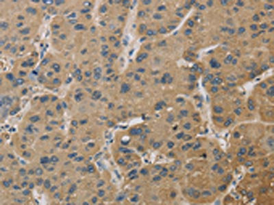 The image on the left is immunohistochemistry of paraffin-embedded Human liver cancer tissue using CSB-PA593332(TBXAS1 Antibody) at dilution 1/30, on the right is treated with fusion protein. (Original magnification: ×200)