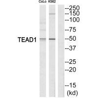 • Western blot analysis of extracts from COLO205/K562 cells, using TEAD1 antibody.
