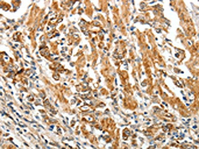 The image on the left is immunohistochemistry of paraffin-embedded Human gastric cancer tissue using CSB-PA699479(TGFBR1 Antibody) at dilution 1/60, on the right is treated with synthetic peptide. (Original magnification: ×200)