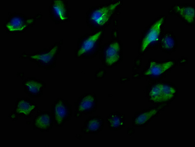 • Immunofluorescence staining of U251 cells with CSB-PA023573OA01HU at 1:50, counter-stained with DAPI. The cells were fixed in 4% formaldehyde, permeabilized using 0.2% Triton X-100 and blocked in 10% normal Goat Serum. The cells were then incubated with the antibody overnight at 4°C. The secondary antibody was Alexa Fluor 488-congugated AffiniPure Goat Anti-Rabbit IgG(H+L).