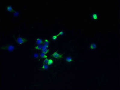 Immunofluorescent analysis of 293T cells using CSB-PA023755LA01HU at dilution of 1:100 and Alexa Fluor 488-congugated AffiniPure Goat Anti-Rabbit IgG(H+L)