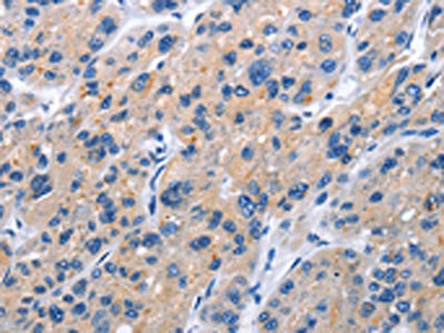 The image on the left is immunohistochemistry of paraffin-embedded Human liver cancer tissue using CSB-PA983768(TNFRSF9 Antibody) at dilution 1/40, on the right is treated with fusion protein. (Original magnification: ×200)