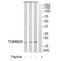 • Western blot analysis of extracts from HeLa cells, K562 cells and A549 cells, using TOMM20 antibody.