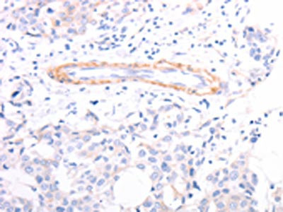 The image on the left is immunohistochemistry of paraffin-embedded Human breast cancer tissue using CSB-PA047043(TPM1 Antibody) at dilution 1/40, on the right is treated with fusion protein. (Original magnification: ×200)
