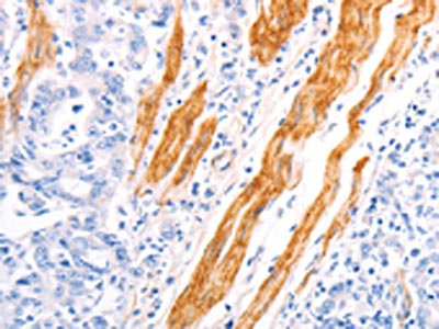 The image on the left is immunohistochemistry of paraffin-embedded Human gastric cancer tissue using CSB-PA047043(TPM1 Antibody) at dilution 1/40, on the right is treated with fusion protein. (Original magnification: ×200)