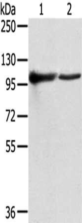 • Gel: 6%SDS-PAGE,Lysate: 40 μg,Lane 1-2: K562 cells, A431 cells,Primary antibody: CSB-PA784922(TPX2 Antibody) at dilution 1/800 dilution,Secondary antibody: Goat anti rabbit IgG at 1/8000 dilution,Exposure time: 10 seconds