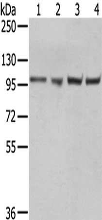Gel: 6%SDS-PAGE,Lysate: 40 μg,Lane 1-4: A431 cells, 293T cells, Hela cells, K562 cells,Primary antibody: CSB-PA251071(TPX2 Antibody) at dilution 1/800 dilution,Secondary antibody: Goat anti rabbit IgG at 1/8000 dilution,Exposure time: 10 seconds