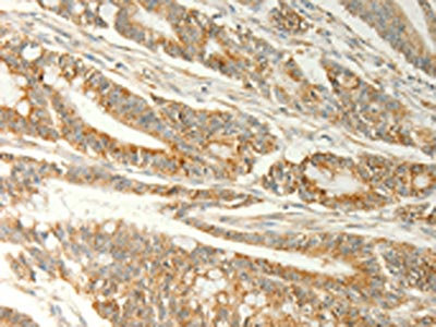 • The image on the left is immunohistochemistry of paraffin-embedded Human colon cancer tissue using CSB-PA436548(TRAF1 Antibody) at dilution 1/20, on the right is treated with fusion protein. (Original magnification: ×200)