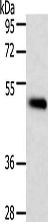 • Gel: 10%SDS-PAGE, Lysate: 40 μg, Lane: Human lymphoma tissue, Primary antibody: CSB-PA436548(TRAF1 Antibody) at dilution 1/350, Secondary antibody: Goat anti rabbit IgG at 1/8000 dilution, Exposure time: 10 seconds