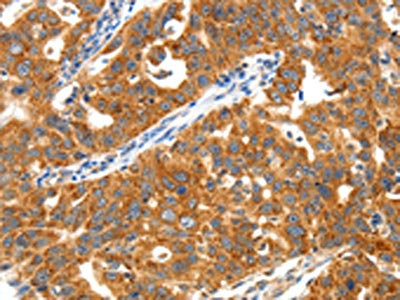The image on the left is immunohistochemistry of paraffin-embedded Human lung cancer tissue using CSB-PA594760(TRAF3 Antibody) at dilution 1/40, on the right is treated with synthetic peptide. (Original magnification: ×200)