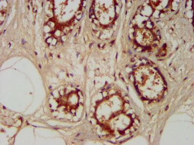 IHC image of CSB-PA024232LA01HU diluted at 1:400 and staining in paraffin-embedded human breast cancer performed on a Leica BondTM system. After dewaxing and hydration, antigen retrieval was mediated by high pressure in a citrate buffer (pH 6.0). Section was blocked with 10% normal goat serum 30min at RT. Then primary antibody (1% BSA) was incubated at 4°C overnight. The primary is detected by a biotinylated secondary antibody and visualized using an HRP conjugated SP system.