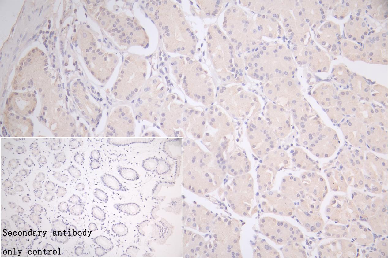 IHC image of CSB-PA866336LA01HU diluted at 1:200 and staining in paraffin-embedded human stomach tissue performed on a Leica BondTM system. After dewaxing and hydration, antigen retrieval was mediated by high pressure in a citrate buffer (pH 6.0). Section was blocked with 10% normal goat serum 30min at RT. Then primary antibody (1% BSA) was incubated at 4°C overnight. The primary is detected by a Goat anti-rabbit polymer IgG labeled by HRP and visualized using 0.05% DAB.Secondary antibody only control: uses 1% BSA instead of primary antibody.