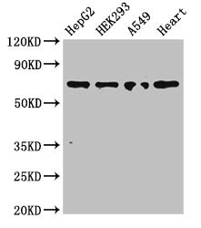 Positive WB detected in: HepG2 whole cell lysate, HEK293 whole cell lysate, A549 whole cell lysate, Mouse heart tissue