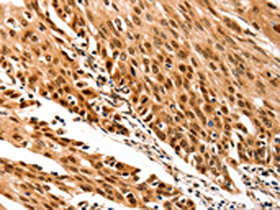 • The image on the left is immunohistochemistry of paraffin-embedded Human cervical cancer tissue using CSB-PA271046(TRIM63 Antibody) at dilution 1/70, on the right is treated with synthetic peptide. (Original magnification: ×200)