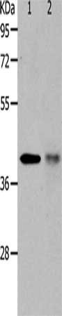 • Gel: 10%SDS-PAGE, Lysate: 40 μg, Lane 1-2: NIH/3T3 cells, human fetal muscle tissue, Primary antibody: CSB-PA271046(TRIM63 Antibody) at dilution 1/1200, Secondary antibody: Goat anti rabbit IgG at 1/8000 dilution, Exposure time: 50 seconds