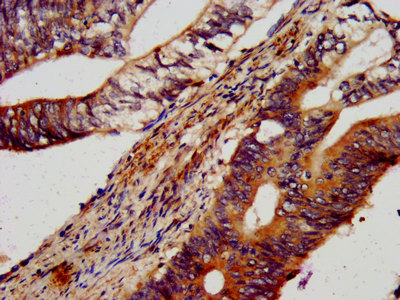 IHC image of CSB-PA652403LA01HU diluted at 1:600 and staining in paraffin-embedded human colon cancer performed on a Leica BondTM system. After dewaxing and hydration, antigen retrieval was mediated by high pressure in a citrate buffer (pH 6.0). Section was blocked with 10% normal goat serum 30min at RT. Then primary antibody (1% BSA) was incubated at 4°C overnight. The primary is detected by a biotinylated secondary antibody and visualized using an HRP conjugated SP system.