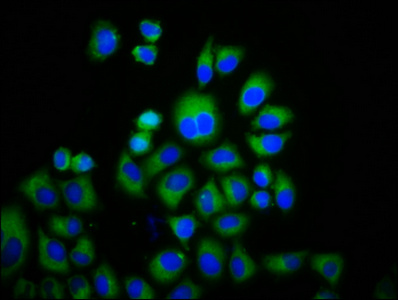 • Immunofluorescence staining of Hela cells with CSB-PA884520LA01HU at 1:133, counter-stained with DAPI. The cells were fixed in 4% formaldehyde, permeabilized using 0.2% Triton X-100 and blocked in 10% normal Goat Serum. The cells were then incubated with the antibody overnight at 4°C. The secondary antibody was Alexa Fluor 488-congugated AffiniPure Goat Anti-Rabbit IgG(H+L).