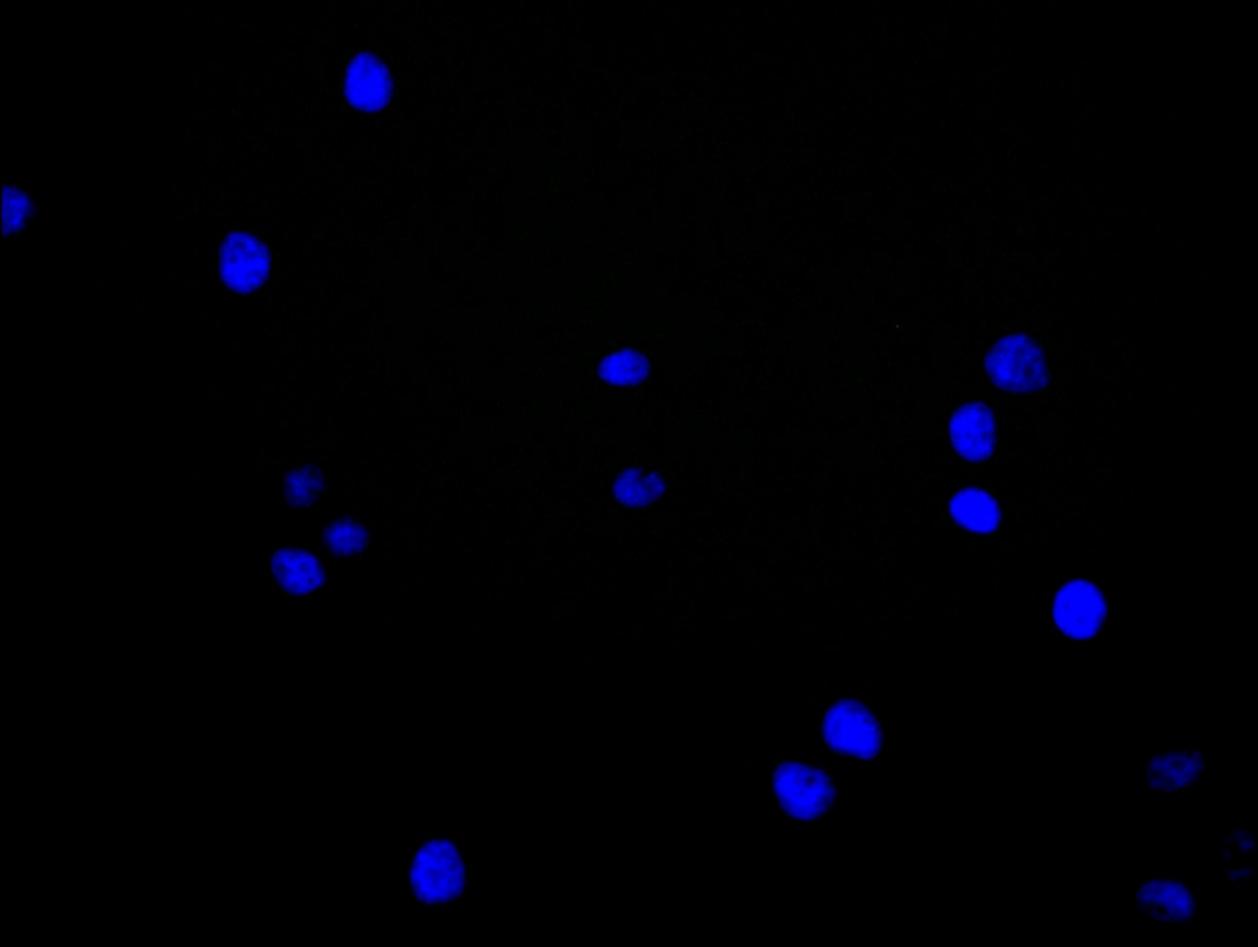 Immunofluorescence staining of Hela cell with 5% goat serum, counter-stained with DAPI. The cells were fixed in 4% formaldehyde and blocked in 10% normal Goat Serum. The cells were then incubated with the antibody overnight at 4C. The secondary antibody was Alexa Fluor 488-congugated AffiniPure Goat Anti-Rabbit IgG(H+L).