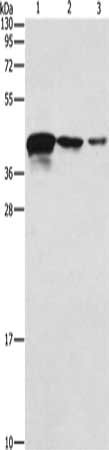 Gel: 10%SDS-PAGE, Lysate: 40 μg, Lane 1-3: Human endometrial carcinoma tissue, A172 cells, U937 cells, Primary antibody: CSB-PA146937(TWF2 Antibody) at dilution 1/800, Secondary antibody: Goat anti rabbit IgG at 1/8000 dilution, Exposure time: 20 seconds