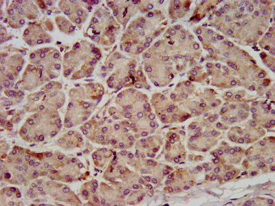 IHC image of CSB-PA842754LA01HU diluted at 1:800 and staining in paraffin-embedded human pancreatic tissue performed on a Leica BondTM system. After dewaxing and hydration, antigen retrieval was mediated by high pressure in a citrate buffer (pH 6.0). Section was blocked with 10% normal goat serum 30min at RT. Then primary antibody (1% BSA) was incubated at 4°C overnight. The primary is detected by a biotinylated secondary antibody and visualized using an HRP conjugated SP system.