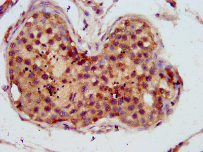 IHC image of CSB-PA842754LA01HU diluted at 1:800 and staining in paraffin-embedded human testis tissue performed on a Leica BondTM system. After dewaxing and hydration, antigen retrieval was mediated by high pressure in a citrate buffer (pH 6.0). Section was blocked with 10% normal goat serum 30min at RT. Then primary antibody (1% BSA) was incubated at 4°C overnight. The primary is detected by a biotinylated secondary antibody and visualized using an HRP conjugated SP system.