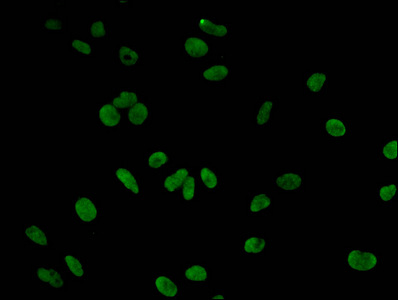 Immunofluorescent analysis of Hela cells using CSB-PA010418OA09me3HU at dilution of 1:100 and Alexa Fluor 488-congugated AffiniPure Goat Anti-Rabbit IgG(H+L)