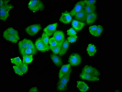 Immunofluorescence staining of HepG2 cells with CSB-PA025463LA01HU at 1:100, counter-stained with DAPI. The cells were fixed in 4% formaldehyde, permeabilized using 0.2% Triton X-100 and blocked in 10% normal Goat Serum. The cells were then incubated with the antibody overnight at 4°C. The secondary antibody was Alexa Fluor 488-congugated AffiniPure Goat Anti-Rabbit IgG(H+L).