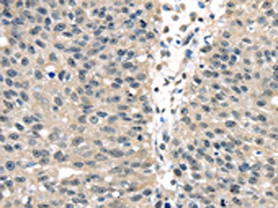 The image on the left is immunohistochemistry of paraffin-embedded Human thyroid cancer tissue using CSB-PA998471(UCHL3 Antibody) at dilution 1/25, on the right is treated with fusion protein. (Original magnification: ×200)