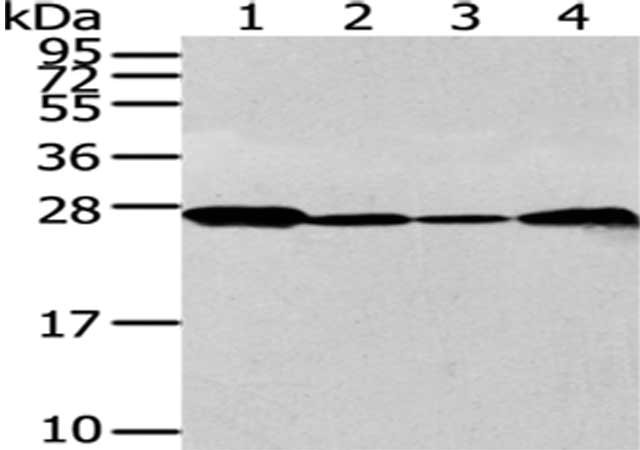 Gel: 12%SDS-PAGE, Lysate: 40 μg, Lane 1-4: 293T, K562, Jurkat and 231 cell, Primary antibody: CSB-PA998471(UCHL3 Antibody) at dilution 1/300 dilution, Secondary antibody: Goat anti rabbit IgG at 1/8000 dilution, Exposure time: 30 seconds