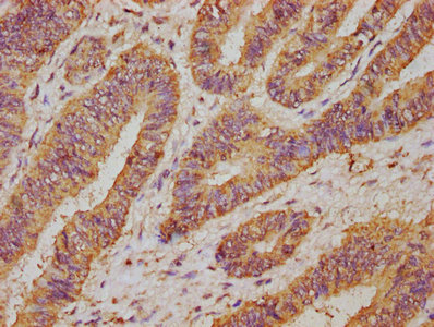 • IHC image of CSB-PA025555EA01HU diluted at 1:50 and staining in paraffin-embedded human colon cancer performed on a Leica BondTM system. After dewaxing and hydration, antigen retrieval was mediated by high pressure in a citrate buffer (pH 6.0). Section was blocked with 10% normal goat serum 30min at RT. Then primary antibody (1% BSA) was incubated at 4°C overnight. The primary is detected by a biotinylated secondary antibody and visualized using an HRP conjugated SP system.