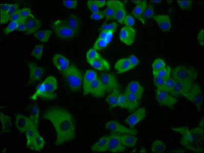 Immunofluorescence staining of MCF-7 cells with CSB-PA025617LA01HU at 1:100, counter-stained with DAPI. The cells were fixed in 4% formaldehyde, permeabilized using 0.2% Triton X-100 and blocked in 10% normal Goat Serum. The cells were then incubated with the antibody overnight at 4°C. The secondary antibody was Alexa Fluor 488-congugated AffiniPure Goat Anti-Rabbit IgG(H+L).