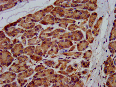 • IHC image of CSB-PA890777LA01HU diluted at 1:200 and staining in paraffin-embedded human pancreatic tissue performed on a Leica BondTM system. After dewaxing and hydration, antigen retrieval was mediated by high pressure in a citrate buffer (pH 6.0). Section was blocked with 10% normal goat serum 30min at RT. Then primary antibody (1% BSA) was incubated at 4°C overnight. The primary is detected by a biotinylated secondary antibody and visualized using an HRP conjugated SP system.