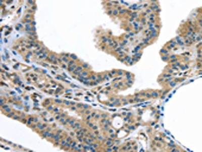 The image on the left is immunohistochemistry of paraffin-embedded Human thyroid cancer tissue using CSB-PA830584(VLDLR Antibody) at dilution 1/40, on the right is treated with synthetic peptide. (Original magnification: ×200)