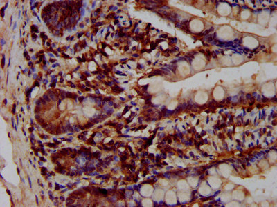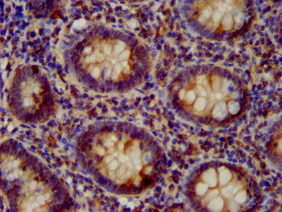 IHC image of CSB-PA850779LA01HU diluted at 1:200 and staining in paraffin-embedded human small intestine tissue performed on a Leica BondTM system. After dewaxing and hydration, antigen retrieval was mediated by high pressure in a citrate buffer (pH 6.0). Section was blocked with 10% normal goat serum 30min at RT. Then primary antibody (1% BSA) was incubated at 4°C overnight. The primary is detected by a biotinylated secondary antibody and visualized using an HRP conjugated SP system.