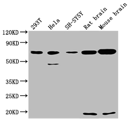 Positive WB detected in: 293T whole cell lysate, Hela whole cell lysate, SH-SY5Y whole cell lysate, Rat Brain tissue, Mouse Brain tissue