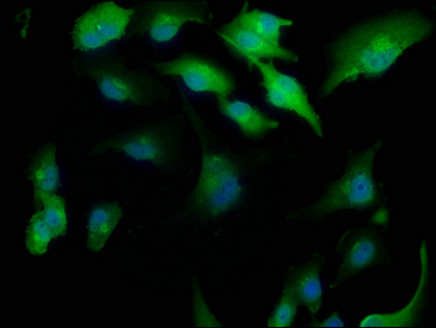 • Immunofluorescence staining of U251 cells with CSB-PA864011LA01HU at 1:166, counter-stained with DAPI. The cells were fixed in 4% formaldehyde, permeabilized using 0.2% Triton X-100 and blocked in 10% normal Goat Serum. The cells were then incubated with the antibody overnight at 4°C. The secondary antibody was Alexa Fluor 488-congugated AffiniPure Goat Anti-Rabbit IgG(H+L).