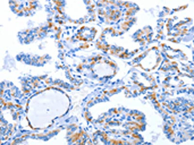• The image on the left is immunohistochemistry of paraffin-embedded Human thyroid cancer tissue using CSB-PA682357(WNT1 Antibody) at dilution 1/50, on the right is treated with synthetic peptide. (Original magnification: ×200)