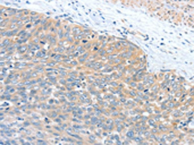 The image is immunohistochemistry of paraffin-embedded Human cervical cancer tissue using CSB-PA796998(WNT3A Antibody) at dilution 1/40. (Original magnification: ×200)