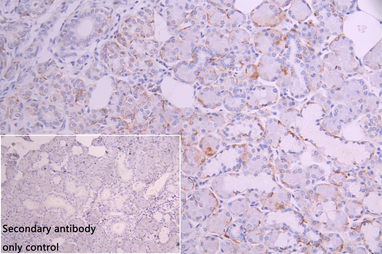IHC image of CSB-PA026138LA01HU diluted at 1:50 and staining in paraffin-embedded human salivary gland tissue performed on a Leica BondTM system. After dewaxing and hydration, antigen retrieval was mediated by high pressure in a citrate buffer (pH 6.0). Section was blocked with 10% normal goat serum 30min at RT. Then primary antibody (1% BSA) was incubated at 4°C overnight. The primary is detected by a Goat anti-rabbit polymer IgG labeled by HRP and visualized using 0.05% DAB. Secondary antibody only control: uses 1% BSA instead of primary antibody