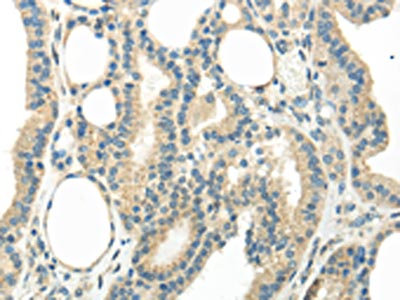 The image on the left is immunohistochemistry of paraffin-embedded Human thyroid cancer tissue using CSB-PA154465(WNT6 Antibody) at dilution 1/35, on the right is treated with synthetic peptide. (Original magnification: ×200)