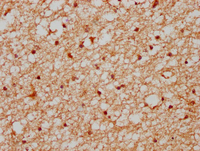 IHC image of CSB-PA862073LA01HU diluted at 1:400 and staining in paraffin-embedded human brain tissue performed on a Leica BondTM system. After dewaxing and hydration, antigen retrieval was mediated by high pressure in a citrate buffer (pH 6.0). Section was blocked with 10% normal goat serum 30min at RT. Then primary antibody (1% BSA) was incubated at 4°C overnight. The primary is detected by a biotinylated secondary antibody and visualized using an HRP conjugated SP system.