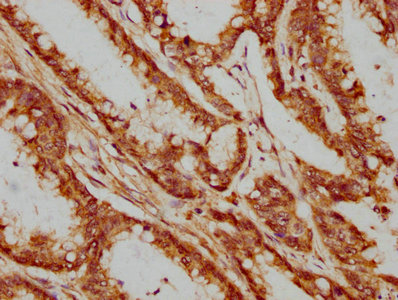 IHC image of CSB-PA862073LA01HU diluted at 1:400 and staining in paraffin-embedded human colon cancer performed on a Leica BondTM system. After dewaxing and hydration, antigen retrieval was mediated by high pressure in a citrate buffer (pH 6.0). Section was blocked with 10% normal goat serum 30min at RT. Then primary antibody (1% BSA) was incubated at 4°C overnight. The primary is detected by a biotinylated secondary antibody and visualized using an HRP conjugated SP system.