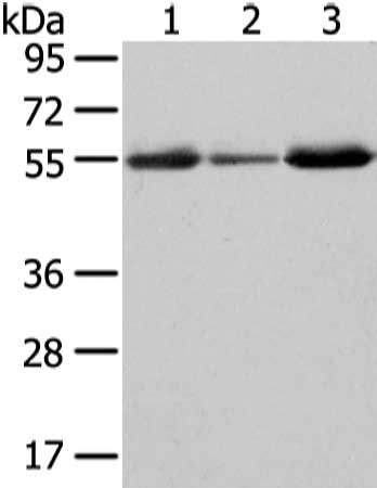 Gel: 8%SDS-PAGE, Lysate: 40 μg, Lane 1-3: Human thyroid cancer and liver cancer tissue, human fetal intestines tissue, Primary antibody: CSB-PA787009(XKRX Antibody) at dilution 1/500 dilution, Secondary antibody: Goat anti rabbit IgG at 1/8000 dilution, Exposure time: 2 minutes
