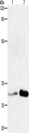 • Gel: 8%SDS-PAGE, Lysate: 40 μg, Lane 1-2: HT29 cells, Mouse brain tissue, Primary antibody: CSB-PA284555(YWHAB Antibody) at dilution 1/750, Secondary antibody: Goat anti rabbit IgG at 1/8000 dilution, Exposure time: 1 minute