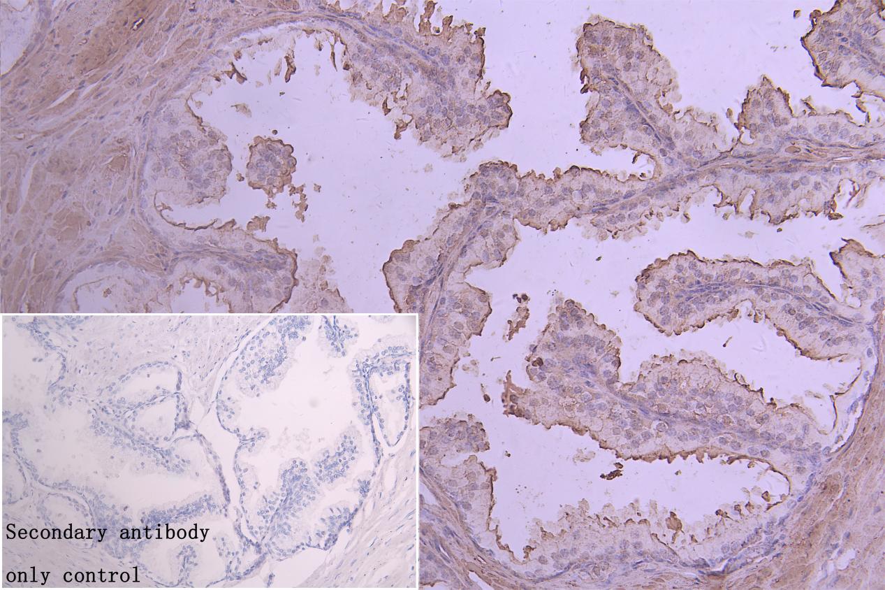 • IHC image of CSB-PA822219LA01HU diluted at 1:20 and staining in paraffin-embedded human prostate cancer performed on a Leica BondTM system. After dewaxing and hydration, antigen retrieval was mediated by high pressure in a citrate buffer (pH 6.0). Section was blocked with 10% normal goat serum 30min at RT. Then primary antibody (1% BSA) was incubated at 4°C overnight. The primary is detected by a Goat anti-rabbit polymer IgG labeled by HRP and visualized using 0.05% DAB. Secondary antibody only control: uses 1% BSA instead of primary antibody