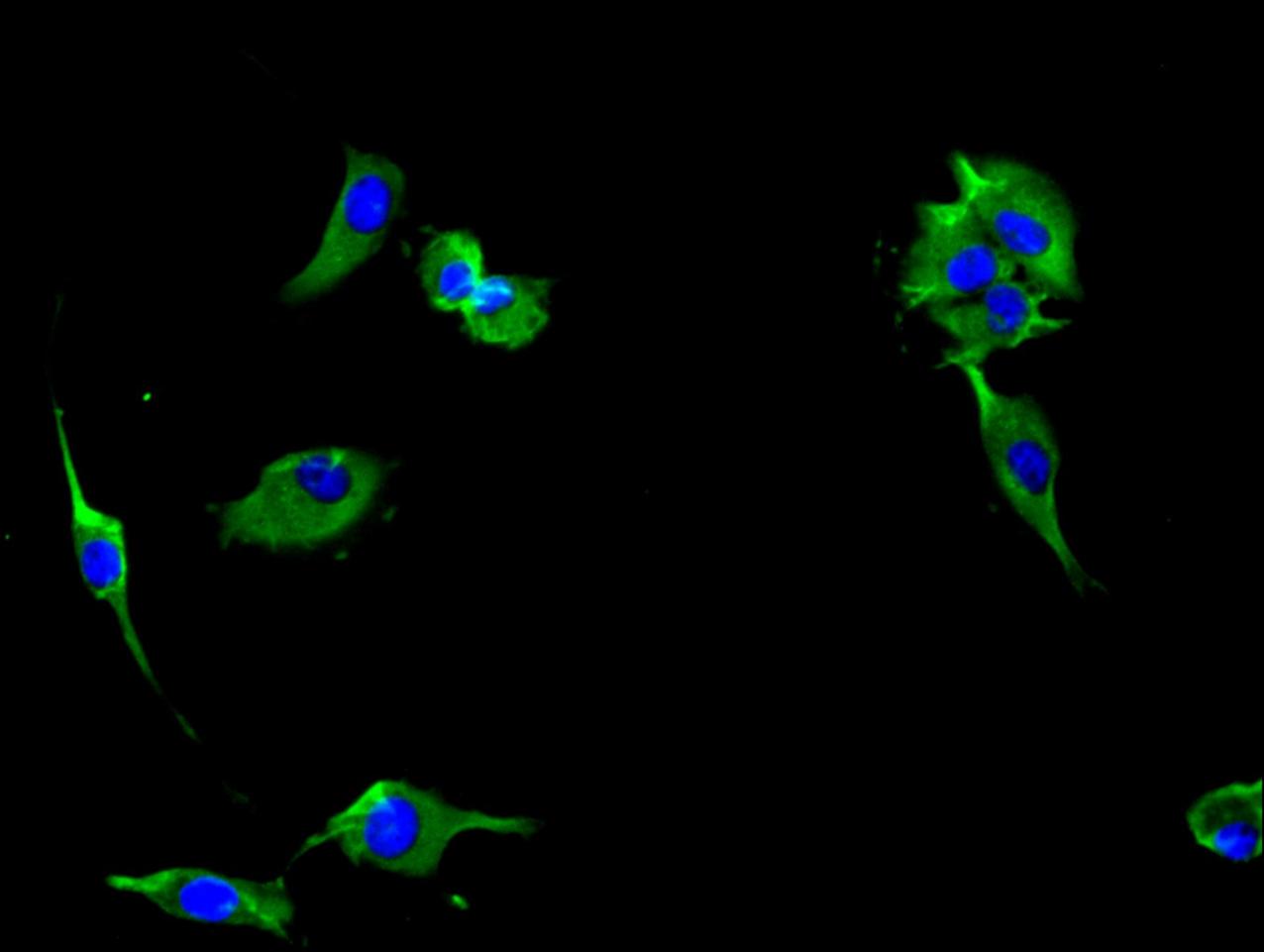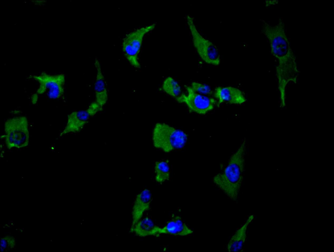 Immunofluorescence staining of U251 cell with CSB-PA873612LA01HU at 1:50, counter-stained with DAPI. The cells were fixed in 4% formaldehyde and blocked in 10% normal Goat Serum. The cells were then incubated with the antibody overnight at 4C. The secondary antibody was Alexa Fluor 488-congugated AffiniPure Goat Anti-Rabbit IgG(H+L).