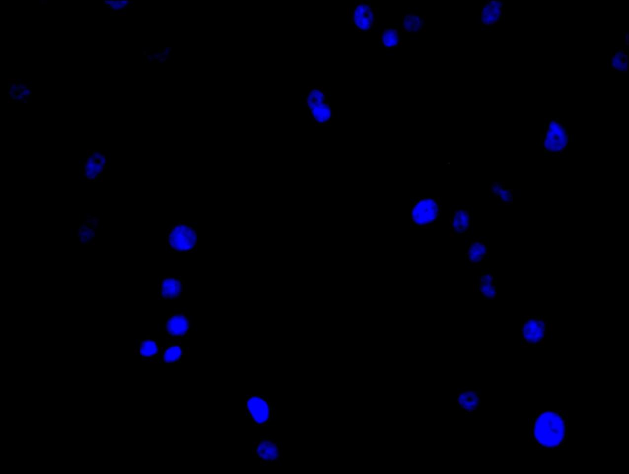 Immunofluorescence staining of HepG2 cell with 5% goat serum, counter-stained with DAPI. The cells were fixed in 4% formaldehyde and blocked in 10% normal Goat Serum. The cells were then incubated with the antibody overnight at 4C. The secondary antibody was Alexa Fluor 488-congugated AffiniPure Goat Anti-Rabbit IgG(H+L).