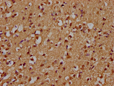 IHC image of CSB-PA026737LA01HU diluted at 1:300 and staining in paraffin-embedded human brain tissue performed on a Leica BondTM system. After dewaxing and hydration, antigen retrieval was mediated by high pressure in a citrate buffer (pH 6.0). Section was blocked with 10% normal goat serum 30min at RT. Then primary antibody (1% BSA) was incubated at 4°C overnight. The primary is detected by a biotinylated secondary antibody and visualized using an HRP conjugated SP system.