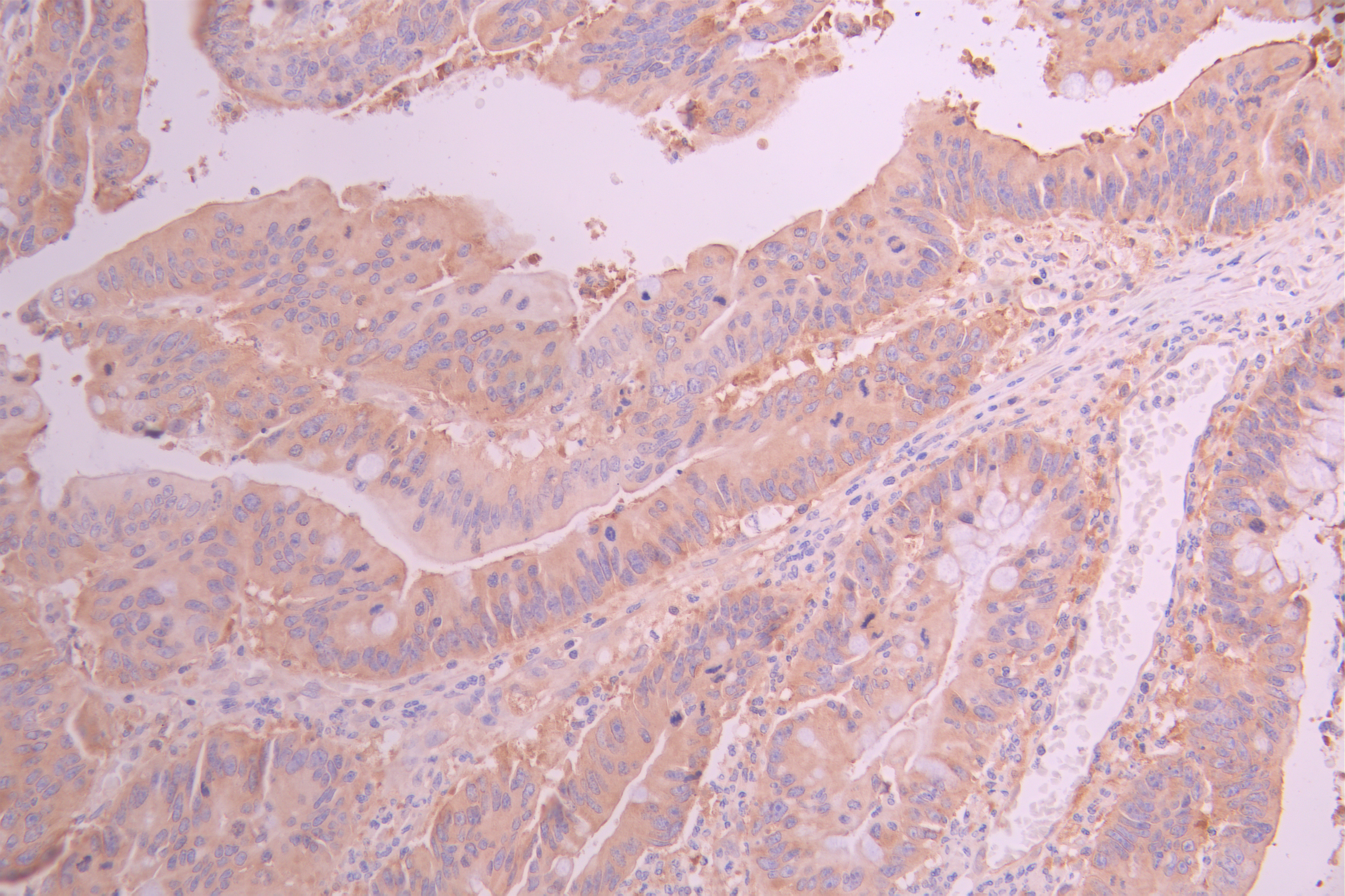 • IHC image of CSB-RA559722A0HU diluted at 1:100 and staining in paraffin-embedded human colorectal cancer performed on a Leica BondTM system. After dewaxing and hydration, antigen retrieval was mediated by high pressure in a citrate buffer (pH 6.0). Section was blocked with 10% normal goat serum 30min at RT. Then primary antibody (1% BSA) was incubated at 4°C overnight. The primary is detected by a Goat anti-rabbit polymer IgG labeled by HRP and visualized using 0.05% DAB.