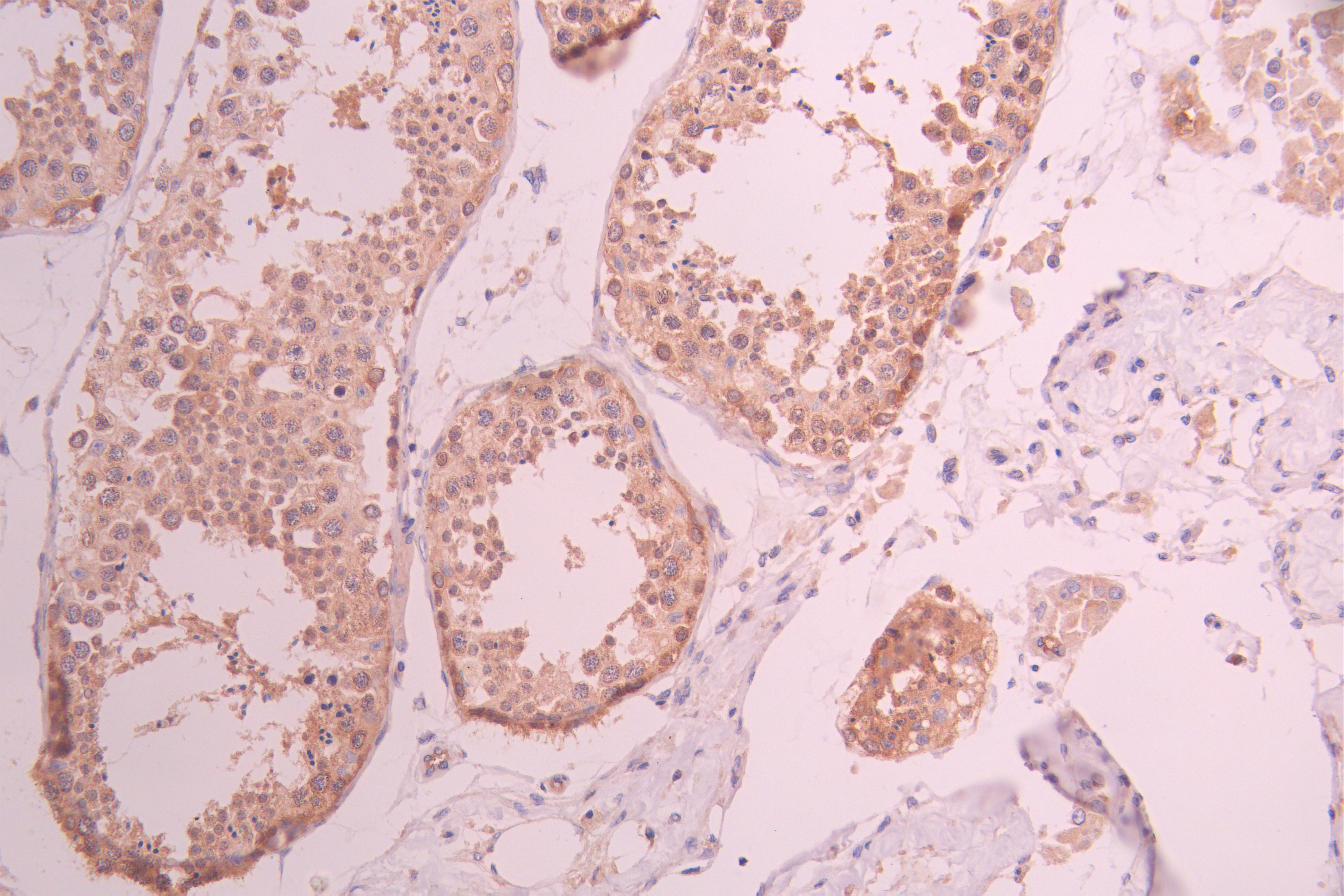 • IHC image of CSB-RA559722A0HU diluted at 1:100 and staining in paraffin-embedded human testis tissue performed on a Leica BondTM system. After dewaxing and hydration, antigen retrieval was mediated by high pressure in a citrate buffer (pH 6.0). Section was blocked with 10% normal goat serum 30min at RT. Then primary antibody (1% BSA) was incubated at 4°C overnight. The primary is detected by a Goat anti-rabbit polymer IgG labeled by HRP and visualized using 0.05% DAB.